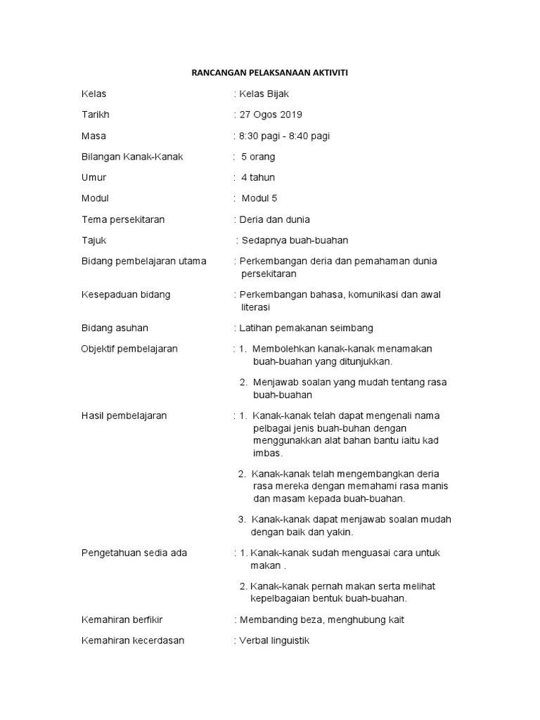 Rpa perkembangan holistik docx rancangan pelaksanaan aktiviti nama. Tulis perkembangan mengikut jurulatih yang mengajarnya /. Tarikh dan hari semasa penyediaan rpa. Perkembangan fizikal nama pendidik : Ada objektif pada akhir pengajaran dan .